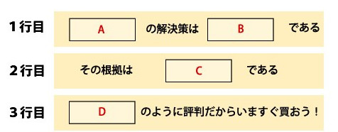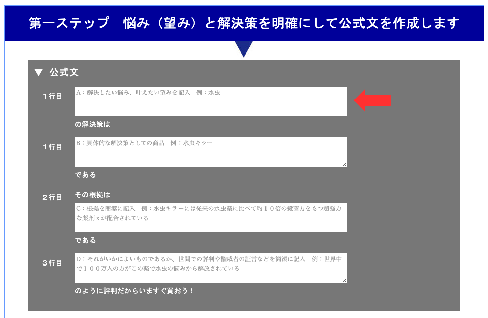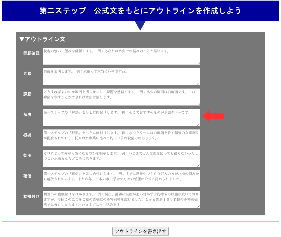 ここで解決策というのは売りたい商品に他なりません。したがってここでは商品名をそのまま入力します。