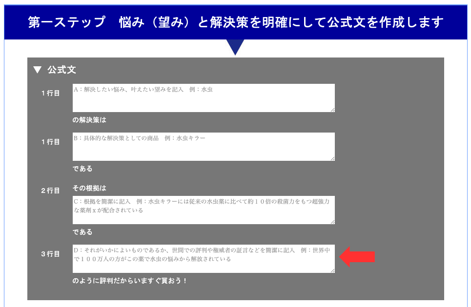 三行目→「世界中で100万人の方がこの薬で水虫の悩みから解放されている」のように評判だからいますぐ買おう!