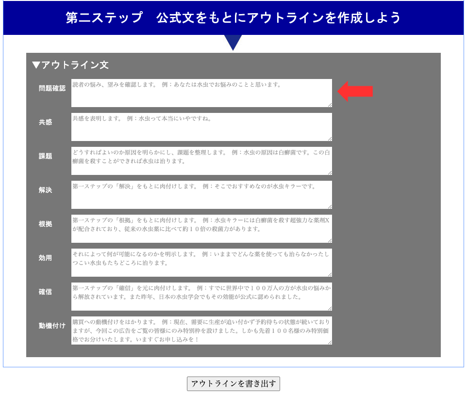 まずは問題確認です。ここでは公式文1行目の悩みまたは望みをもとに入力します。